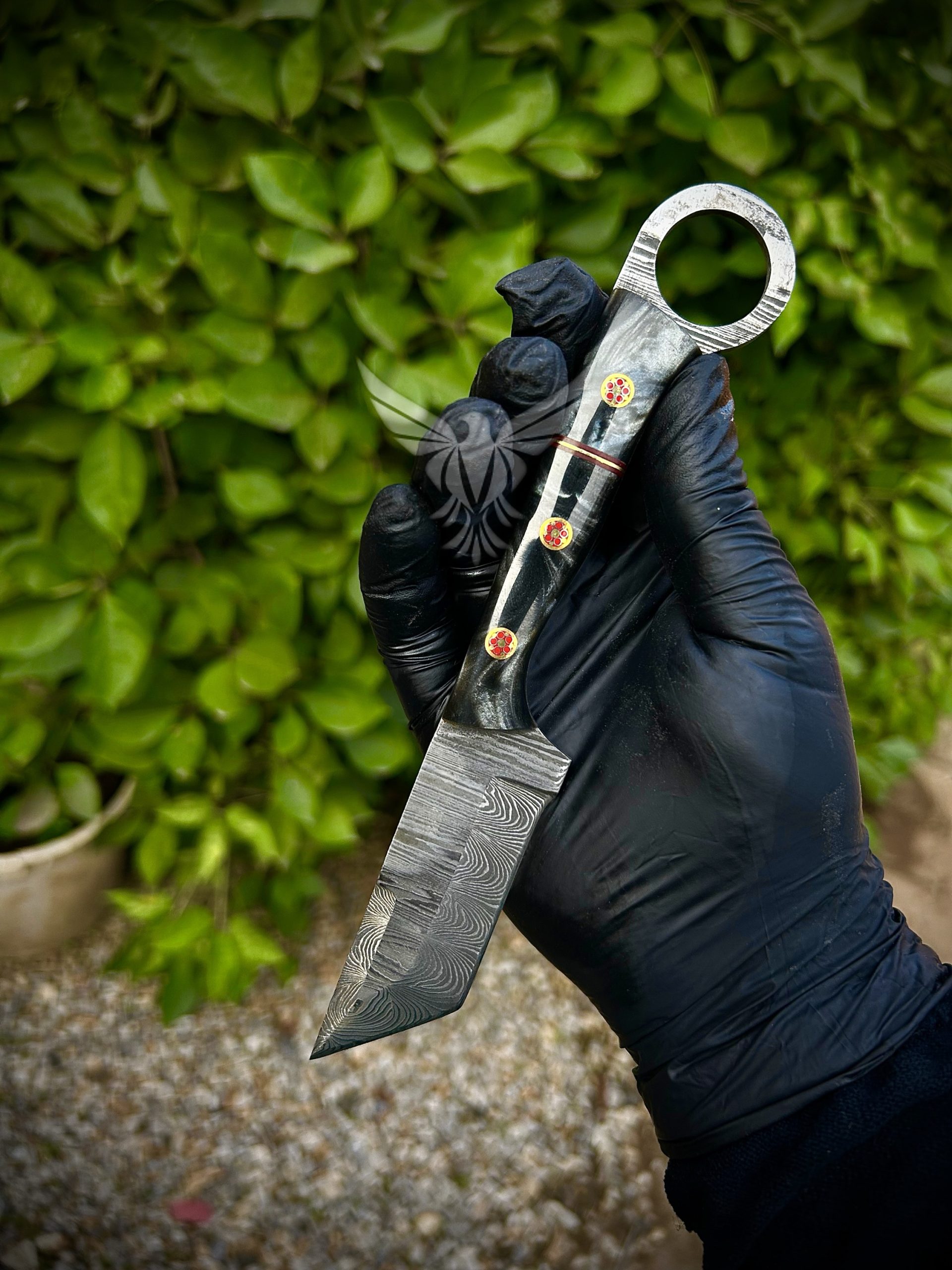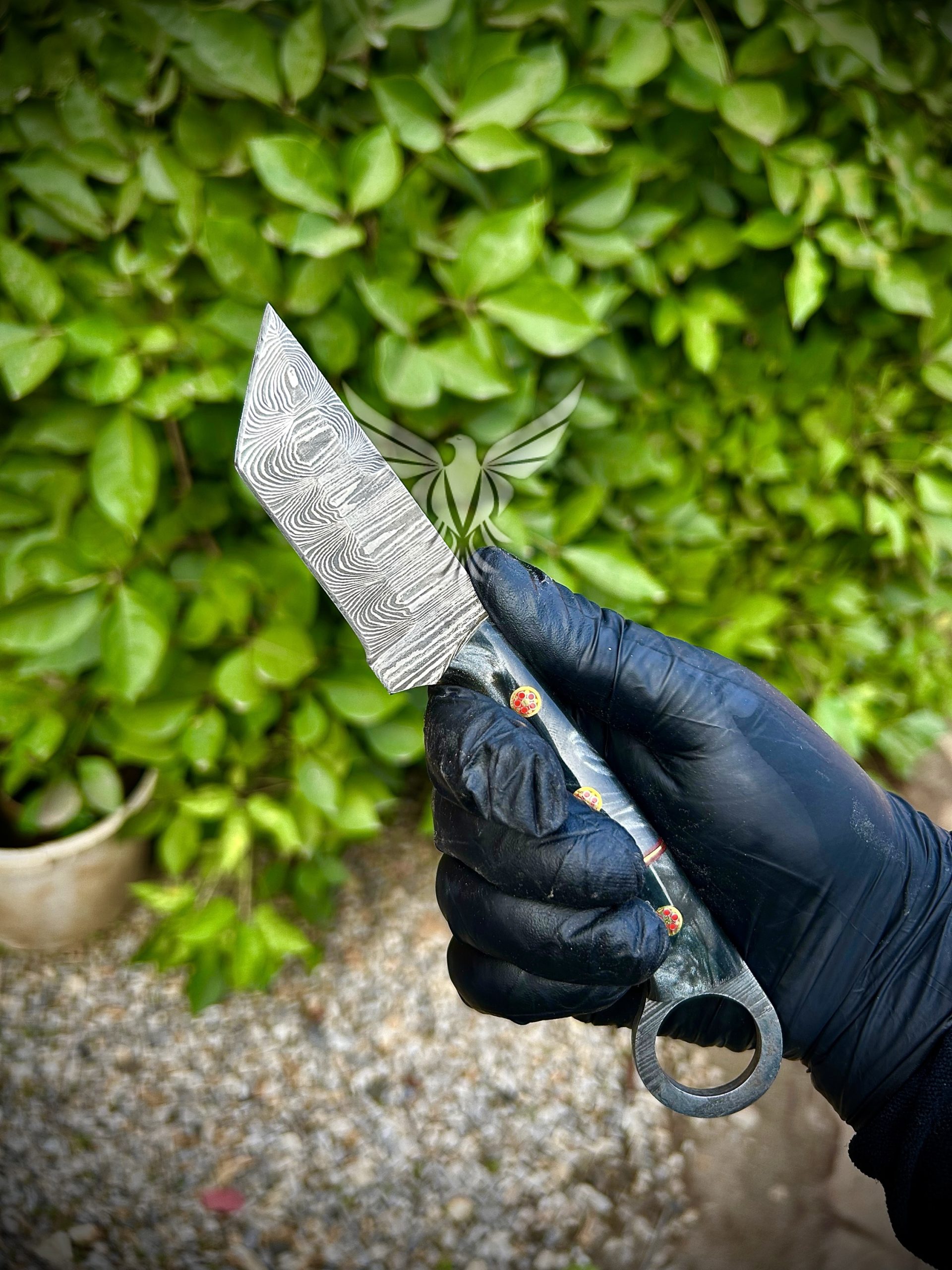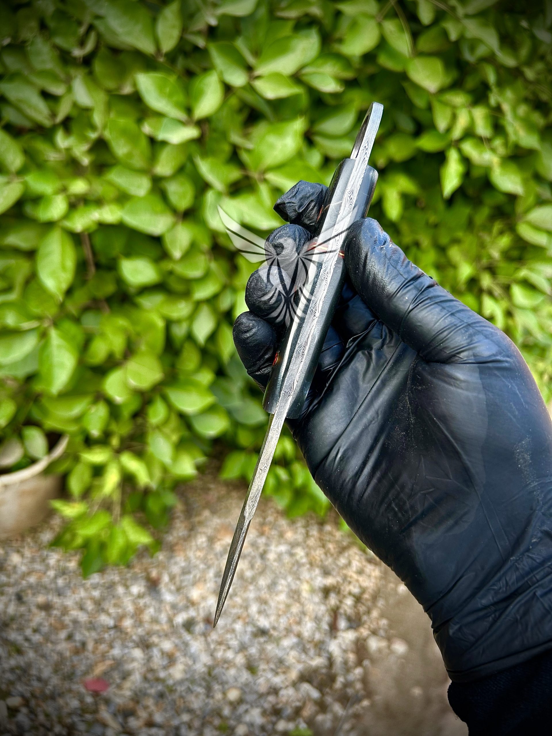 The blade is made from hand-forged Damascus steel, renowned for its superior edge retention, strength, and unique wave-like pattern — no two knives are exactly alike. Its curved profile and razor-sharp edge make it ideal for skinning game, detailed fieldwork, and general utility tasks, whether you’re deep in the woods or working at your campsite.